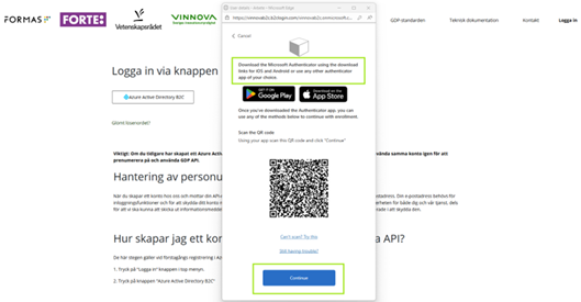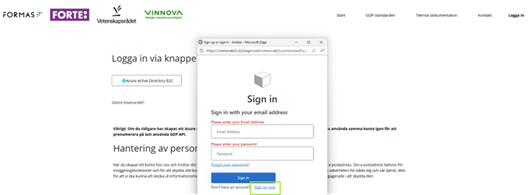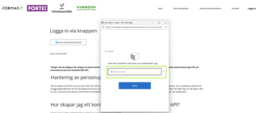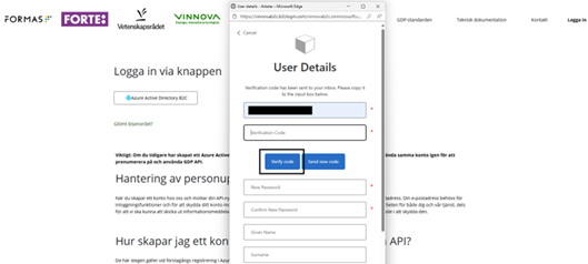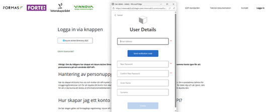 Viktigt: Om du tidigare har skapat ett Azure Active Directory B2C-konto för att använda Vinnovas E-tjänster, kan du använda samma konto igen för att prenumerera på och använda GDP API.